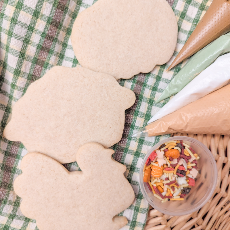 6 undecorated vanilla sugar cookies (2 each shape), 3 icings, sprinkles, and instructions